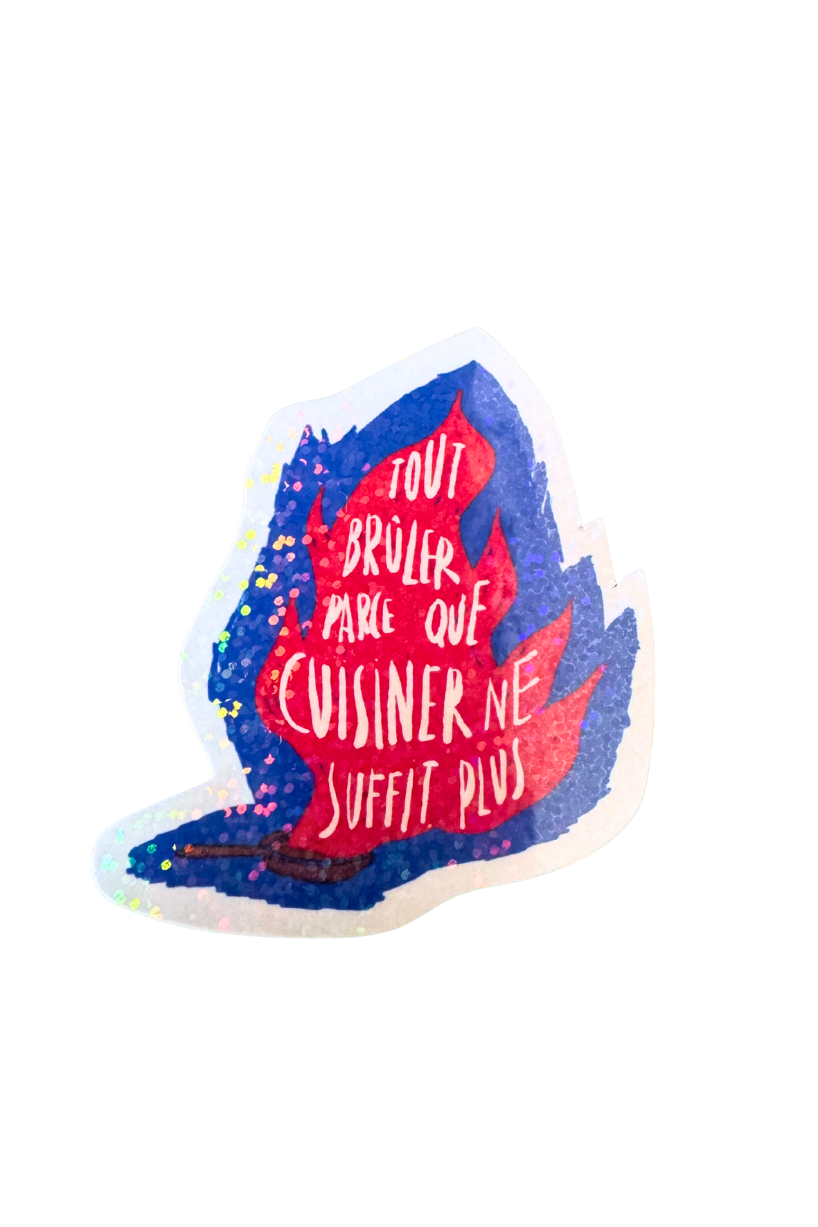 Sticker Tout brûler parce que Cuisiner ne suffit plus holographique paillettes. 7x7cm. Imprimé en France. En savoir plus